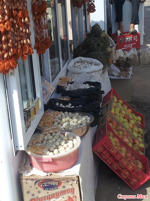 На обратном пути мы остановились у базарчика с местными дарами природы. Курт - из козьего и коровьего молока, сушеный горох нут, соленые орешки разные.