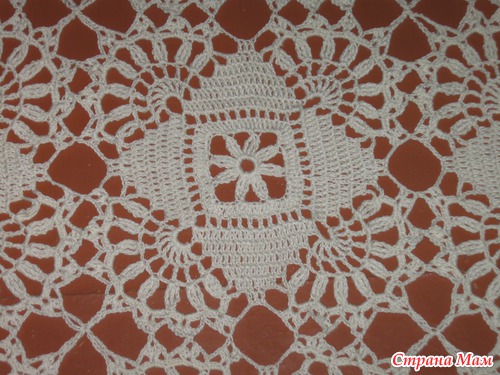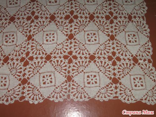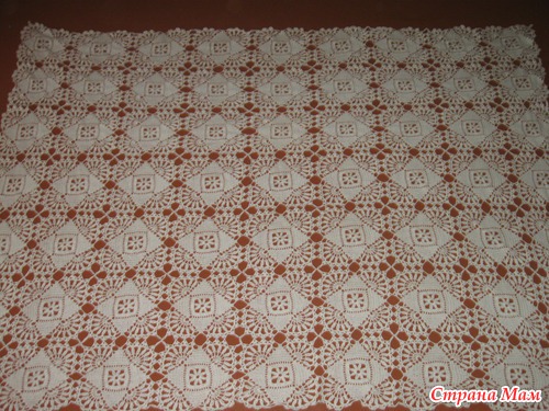 Скатерть прямоугольной формы мотивами. Размер 190 х 140 см, 63 мотива. Нитки СОСО, крючок № 1,5. Заказчица осталась довольна, я тоже. Из одного мотка получается 3,5 мотива. Специально считала, сколько я в день смогу вывязать. Получилось 2 мотка, т. е. 6 мотивов, но так много я редко вязала. Вязала 1,5 месяца с перерывом на недельный ремонт.