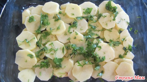 Форму сбрызнуть маслом, выложить картошку + зеленушечка