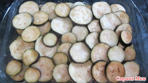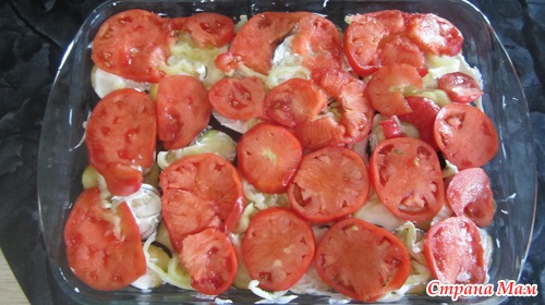 Поверх баклажанов перчик болгарский соломкой и помидоры