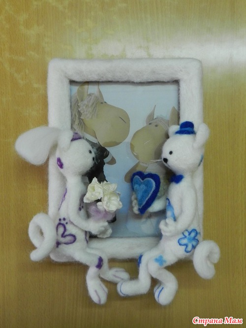 а именно валяная свадебная парочка. Так как девичья фамилия сестренки была кошачья, решено было свалять кошечек. Обычную пару игрушек тоже делать не хотелось, поэтому придумалась фоторамка.