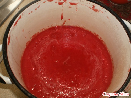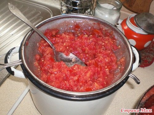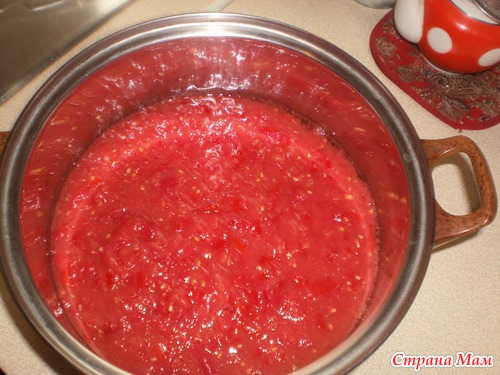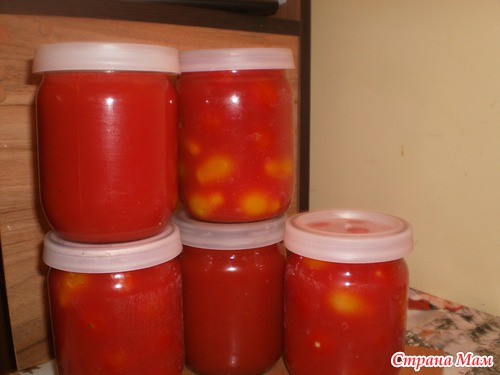 Добавляю еще облегченней рецепт у кого нет времени или кому лень перетирать помидоры. Делаем все тоже только томатный сок покупаем в магазине. Я советую сок делать самим, он очень вкусный. Магазинный не такой. А помидоры в натуральном соке вообще супер.