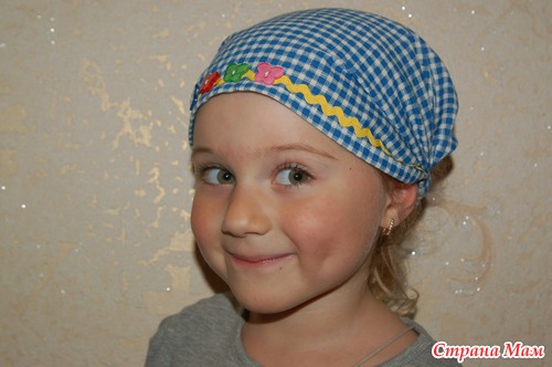 Бандану раскроила, пересняв выкройку с имеющейся у нас трикотажной банданы.