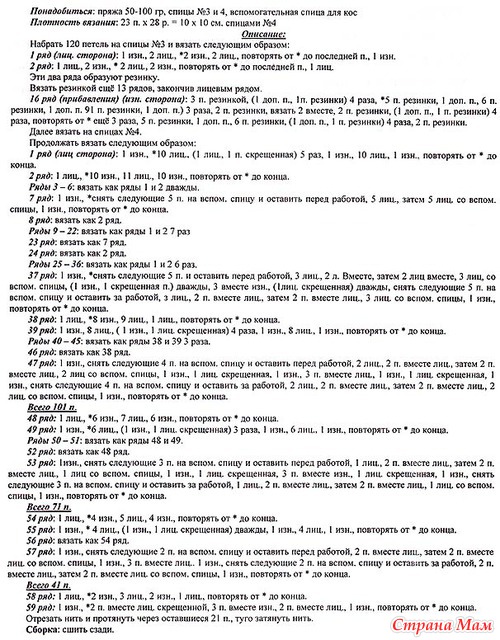Рад 57: 1 изн., снять следующие 2 п. на спицу для кос и оставить перед работой, 2 вместе лиц., затем 2 вместе лиц. со спицы для кос, 1 изн., 3 вместе изн., 1 изн., снять следующие 2 п. на спицу для кос и оставить за работой, 2 вместе лиц., затем 2 вместе лиц. со спицы для кос, 1 изн. Повторять от * до конца.