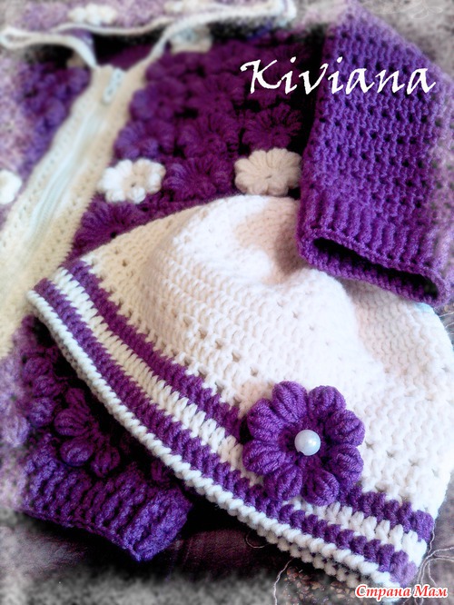Комплект вязала на возраст 3-4годика из полушерсти. Пряжа Пехорка Перспективная фиолетового цвета чуть более 400г и белой - 50г, крючок Nr.3: