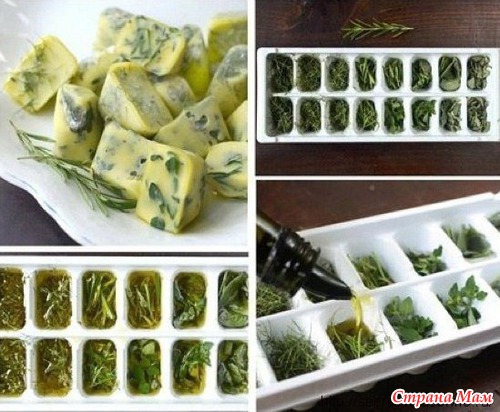 Вам необходимо мелко нарезать зелень (лук, петрушку, укроп и т. п.), утрамбовать в формочки для льда и залить оливковым маслом. Теперь ставим формочки в морозилку и больше не беспокоимся о сохранности зелени. Полученный продукт вы можете добавить в пасту, гуляш, рагу и, конечно же, салат.