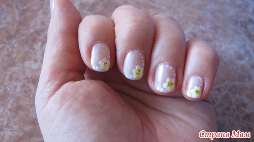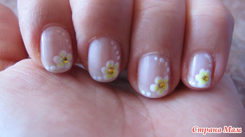 если цветочки, то да, по-больше белым, и по-меньше салатовым, потом быстренько вытирала и доставляла точечки, чтобы зрительно удлинить ноготь, а потом камушек поставила и сверху прозрачным закрыла (дотсом получается одинаково на двух руках , хотя можно и зубочисткой и шариковыми ручками)