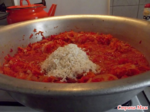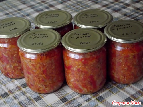 Засыпать промытый рис. Перемешать. Тушить на медленном огне 40 минут под крышкой. Временами перемешивать, так как салат густой. Закатать в чистые баночки. Перевернуть, укутать до остывания.