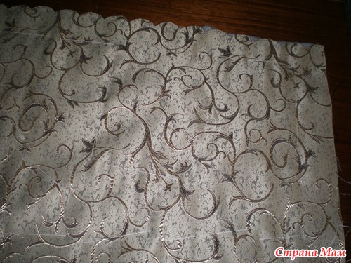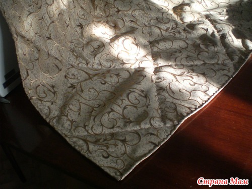 Края обметала на спец машине оверлок. Край обработала швом вподгибку с открытым срезом, уголки заложила треугольником.