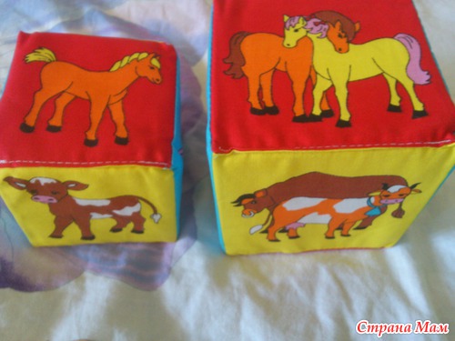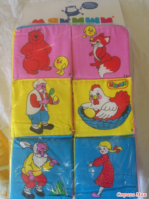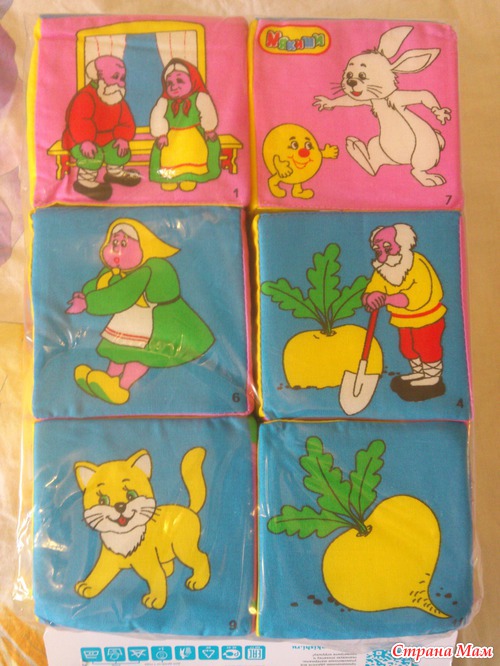 Себе мы оставили кубики "чей детеныш" и "предметы", а "сказку" подарили полуторагодовалому братику. Он собирает из них пирамиду, использует как стул и с мамой ищет дедушку, бабушку, котика и т. д. (там три сказки 1. Репка, 2. Курочка Ряба (это которая с яйцом золотым) и 3. Колобок).