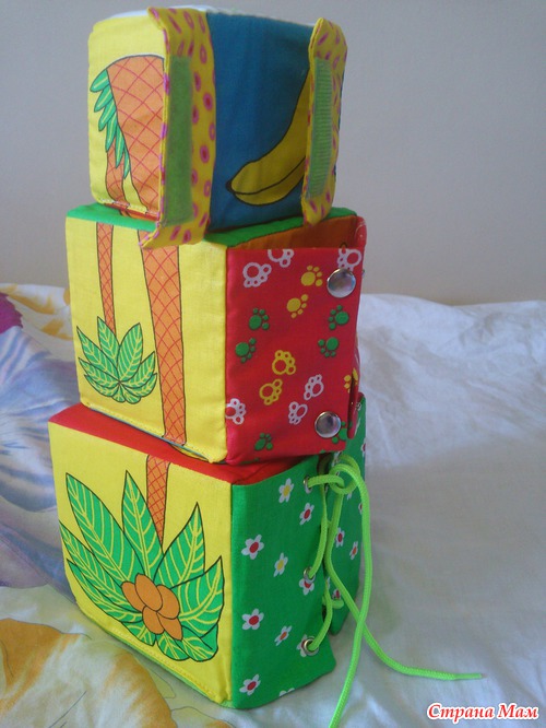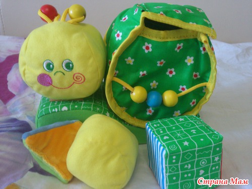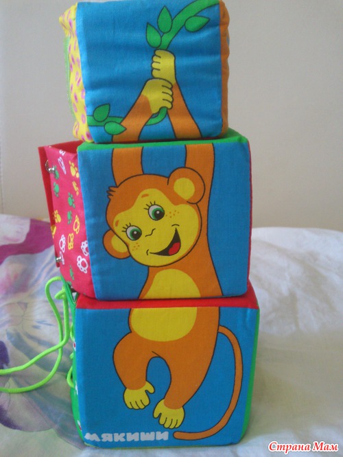 Из трех кубиков состоит "мартышка", они разные по размеру и на каждом есть какая-то застежка (нам понравился шнурок