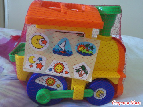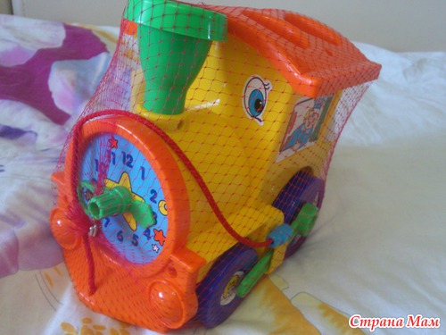 В подарок взяла паровозик. Веревочка коротковата, даже для полуторагодовалого малыша, пришлось в деревне искать что можно еще для длины прицепить. Пару часов малыш даже кидал внутрь паровоза кружочки и квадратики, но потом благополучно их куда дел