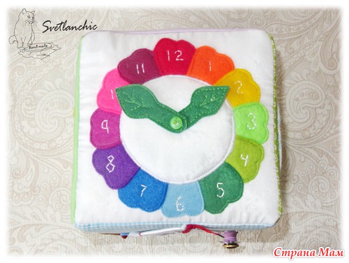 Верхняя грань многофункциональная Часики-радуга, стрелочки вращаются. Знакомимся с цветами и оттенками, с цифрами, с часиками.