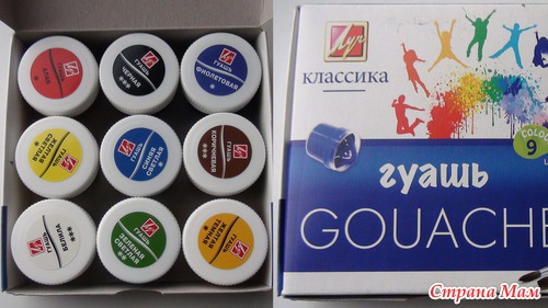 Очень обрадовалась, когда открыла коробку с гуашью. Здесь баночки подписаны и не надо вынимать все из коробки, чтобы найти нужный цвет: