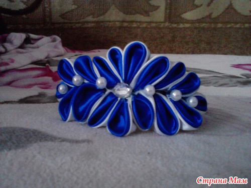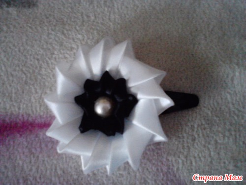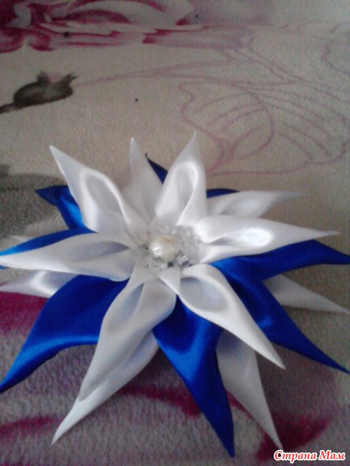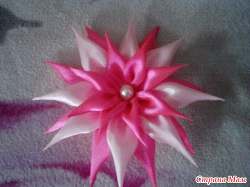 Позвольте дать вам маленький совет: когда собираете круглый лепесток из 2 цветов лент, попробуйте когда выровняли оба треугольничка, скрепить их тонкой булавкой от уголка к середине треугольничка и потом загибать края. Знаю по себе - лента скользит - очень трудно удержать , поэтому такой прием мне помогал складывать более ровные лепестки.