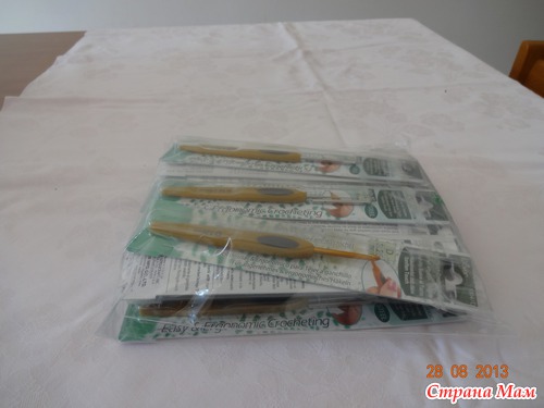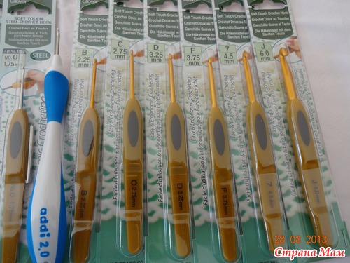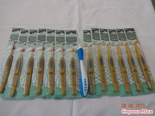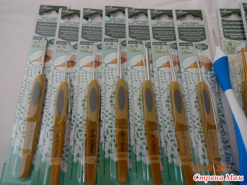 Вот жила я себе спокойно и жила, и даже вязала крючками-палочками, которые в магазинах продаются, и даже не знала о существовании кловеров, пока не попала в Страну Мам. Вот тут я о них и узнала и сайты мне показали, где они продаются. Но я вяжу немного, а сестра вяжет даже на продажу и захотелось мне подарить ей такие крючки. Долго я думать не стала, те более сестре 50 исполняется, к юбилею надо успеть и заказала. Стальные заказала всю линейку от 0,5 до 1,75 и зря, нужно было с единицы заказывать. Они очень тонкие и я с моим зрением даже не вижу и потом мне показалось, что они тоньше обычных крючков. Конечно повязала я только двумя, №1 и 1,25, понравилось очень. Теперь буду думать, как заказать и себе такие же.