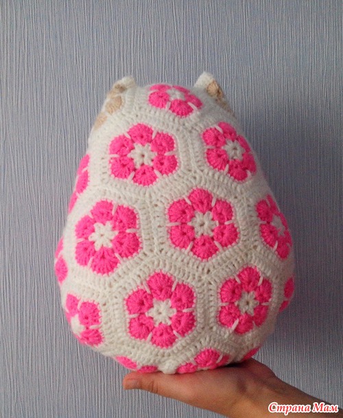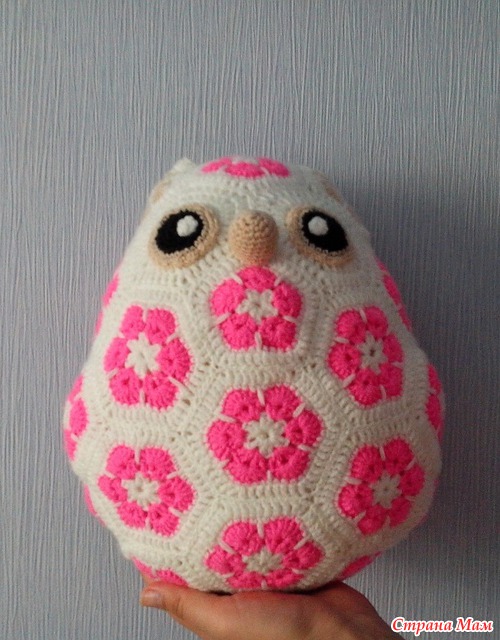 Ходила я по инету и набрела на такое чудо - игрушки из мотивов "Африканский цветок". Долго думала, смотрела, любовалась, а потом решилась связать. Вот моя сова-подушка для дочки, ей она очень нравится.