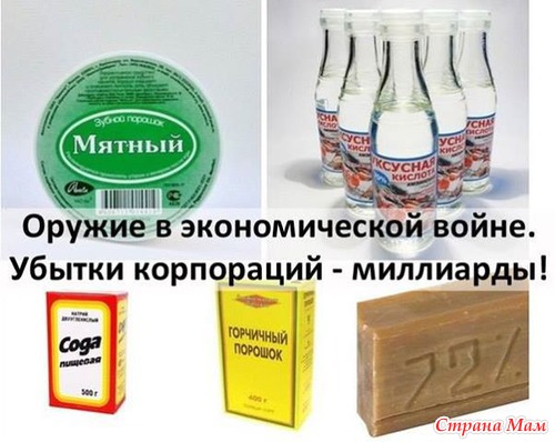 Оружие в экономической войне против корпораций = сода + горчичный порошок + хозяйственное мыло + уксус + лимонная кислота + зубной порошок = полная замена всей хозбытхимии и средств гигиены = убыток корпораций - миллиарды.