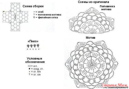 Описание работы Связать 38 круговых мотивов и 8 половинок мотива, соединяя их друг с другом при вывязывании последнего ряда (см. схему сборки).