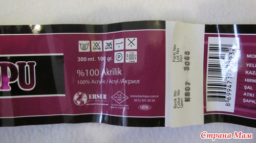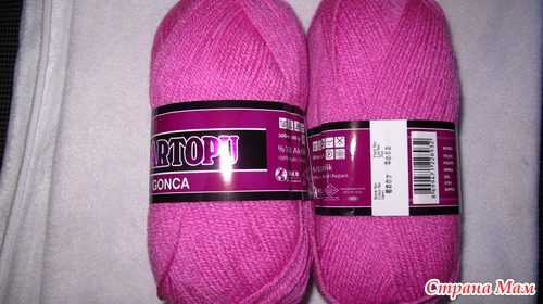 Из того, что у нас продают, остановила свой выбор на Kartopu Gonca (100% акрил, 100г/300м, подходит для спиц - 4, крючок - 4, плотность 18х27 п.), спицы 4.
