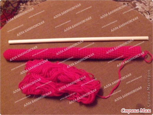 Затем вязать ряды без изменений до нужной длинны, взять деревянную палочку обмотать её синтепоном (если она слишком тонкая), вложить в связанный "чехол" и затем убавлять столбики до самого конца.
