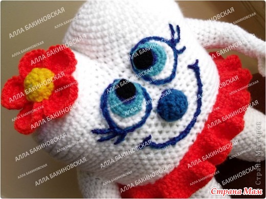 Синие и чёрные зрачки провязаны более тонкой ниткой и крючком № 3.