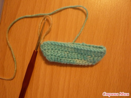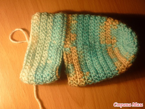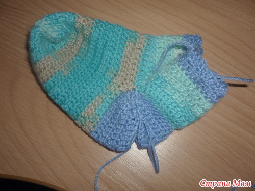 изделие выворачиваем на изнанку и соединяем столбиком без накида, обрываем нить. Второй носочек вяжем так же. Вот что у нас получается
