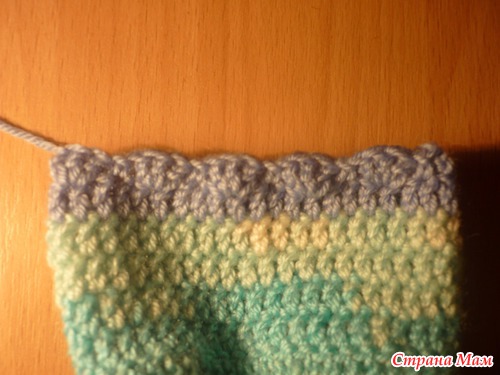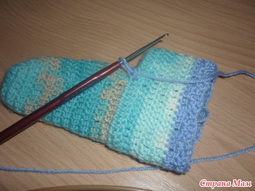 (вид сбоку). Вяжем основным узором 5 рядов. далее 1 ряд ст с н., я взяла другой цвет чтобы хотя бы немного украсить носочки