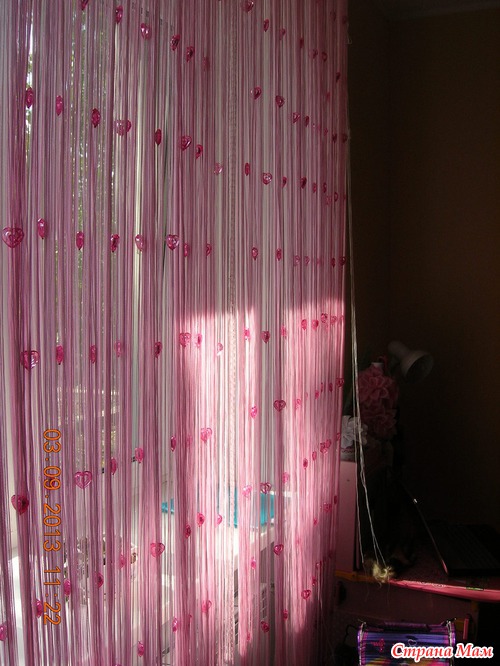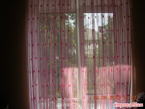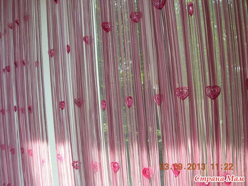 ВНИМАНИЕ: стеклярус в виде сердечек на одной шторочке с лицевой стороны, а на другой с изнаночной. Ну если бы шторы не были собраны так сильно (две трехметровые шторы на карниз 2 метра), видно не было бы, но у меня (не знаю как у Вас легких путей не бывает). Со стороны комнаты еще не чего, но с улицы