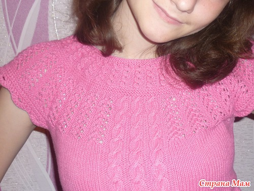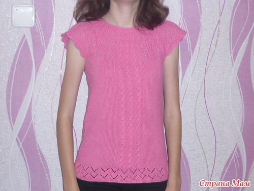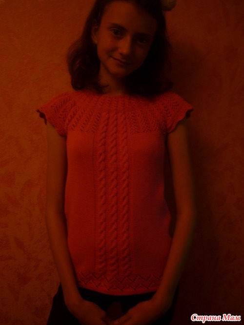Я изменила немного низ кофточки и перед вязала косами и лицевой гладью.