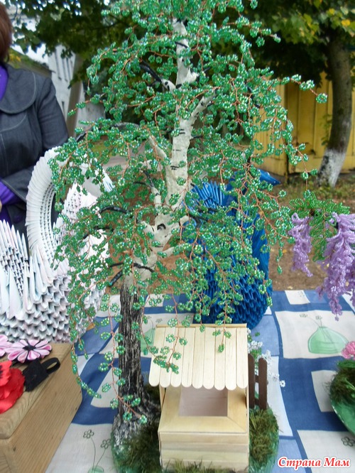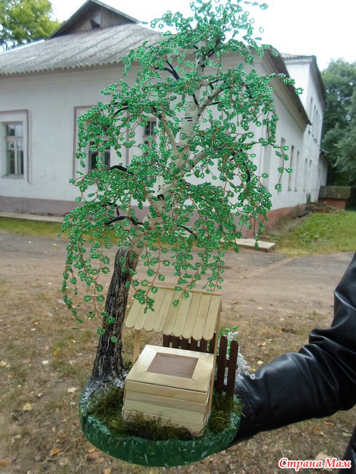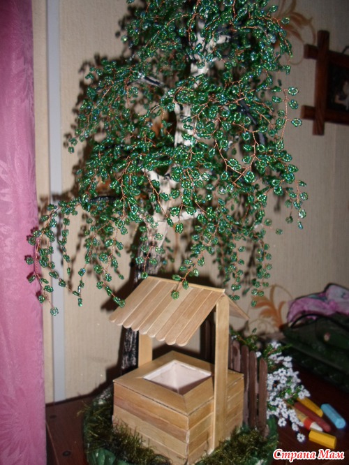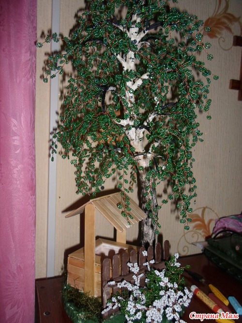 Но успела сделать пару новых работ одна из них береза, высотой 45см, а под ней колодец, сделанный из палочек от мороженного и медицинских шпателей. Это первая моя большая бисерная работа!