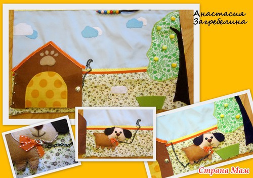 Будка-дверка на кнопке, игрушка-собака на цепи (отстегивается), перемещается на липучках к миске, пуговицы для дополнительного массажа, миска-карман