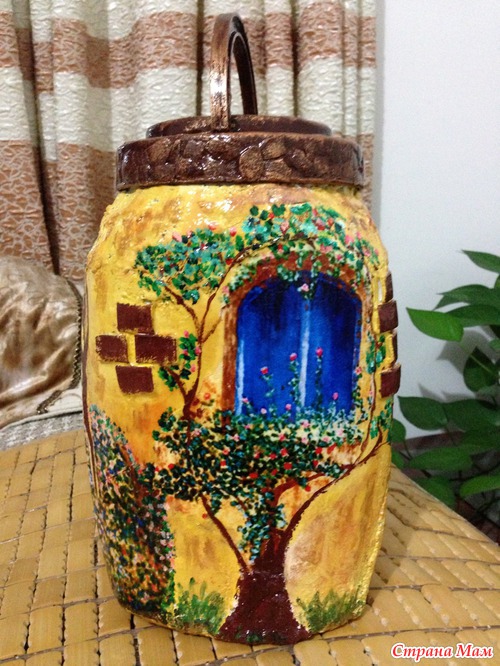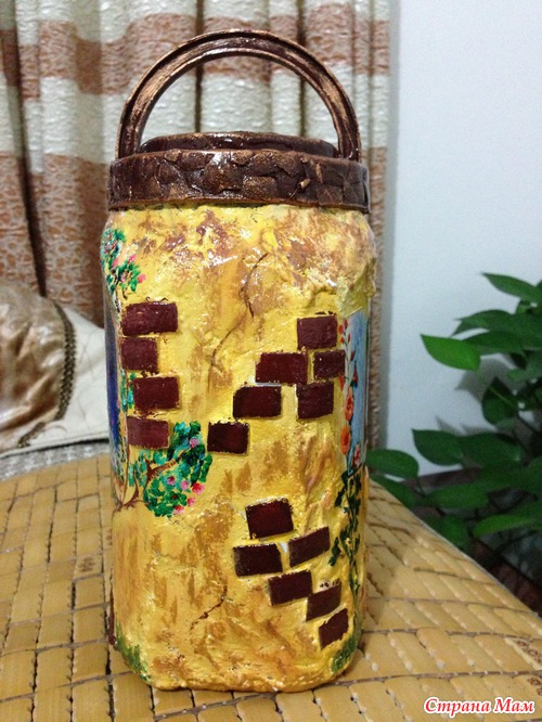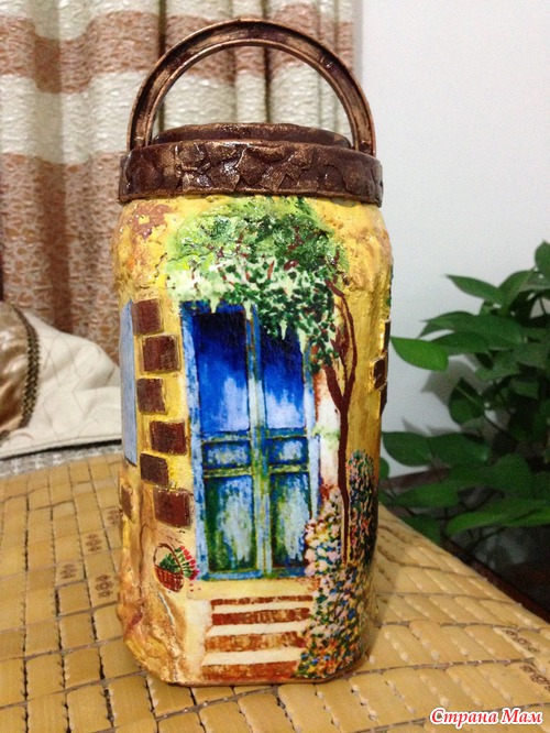 Здравствуйте, уважаемые мастера и мастерицы! Недавно на просторах интеренета увидела декупаж на кирпичах. И подумала, а почему бы не сделать такое же на банке. Тем более, большая пластиковая банка есть, можно развернуться. Процесс создания дома меня очень увлек, поэтому решила, что это будет не последняя моя банка-домик. Теперь будет там храниться овсянка. Вот, что из этого получилось.