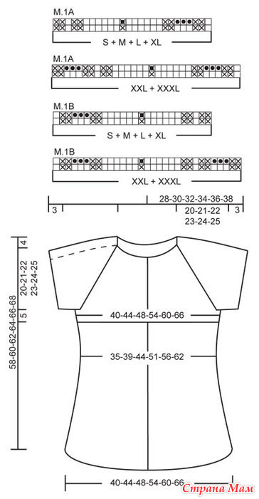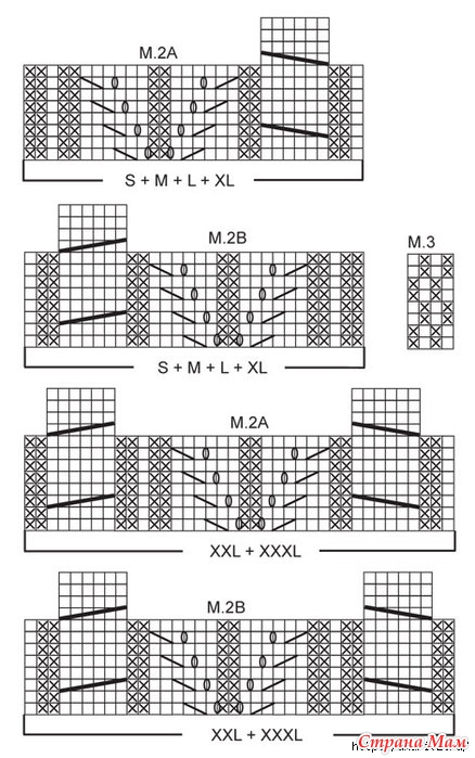 Провязать первый р. с изн. стороны след. образом: 6 п. планки переда платочной вязкой, продолжить по схеме M.3 как ранее на следующих 30-34-37-42-47-52 п., провязать лицевой гладью 54-58-60-64-68-72 п. (= изн. с изн. стороны, лиц. с лиц. стороны), продолжить по схеме M.3 на след. 60-66-74-84-94-104 п. как ранее, провязать лиц. гладью 54-58-60-64-68-72 п., продолжить по схеме M.3 на след. 30-34-37-42-47-52 п. и закончить 6 п. планки переда платочной вязкой. Продолжить по узору таким же образом, ОДНОВРЕМЕННО в первом р. с лиц. стороны убавить для реглана в каждом месте перехода от основной детали к реглану следующим образом – см. Подсказку по убавкам-2: