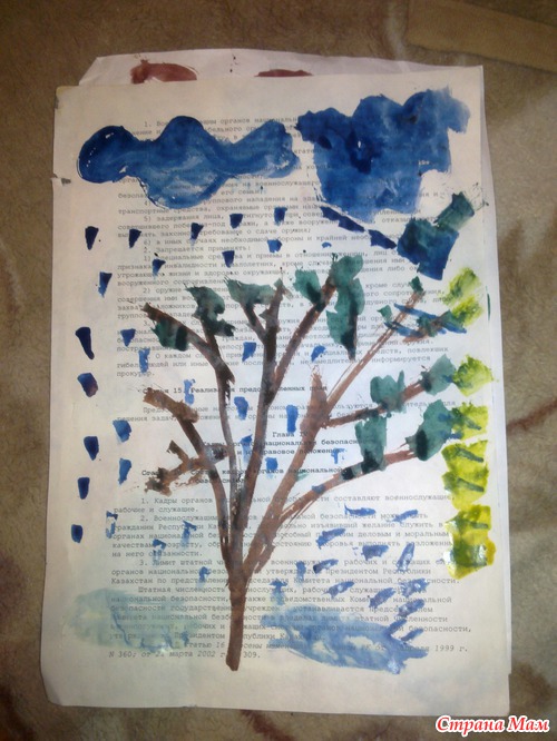 А это Яна (4 года) уже дома рисовала дерево с листочками под дождем и где то с боку светит солнце)))