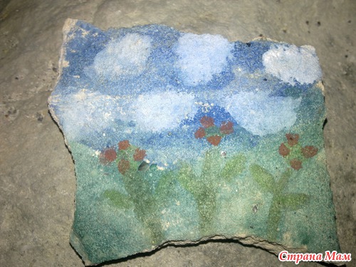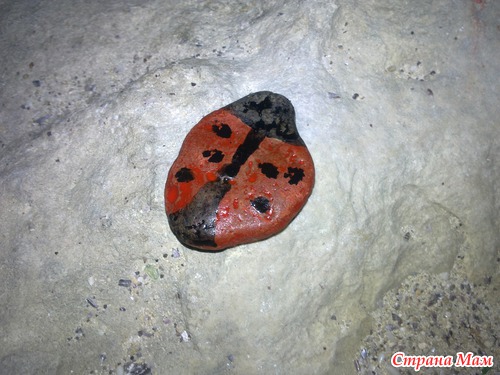 Собрали камушки, достали краски и приступили к делу. Художники из нас ни какие, но главное процесс. Это Янины художества: синий камень и божая коровка