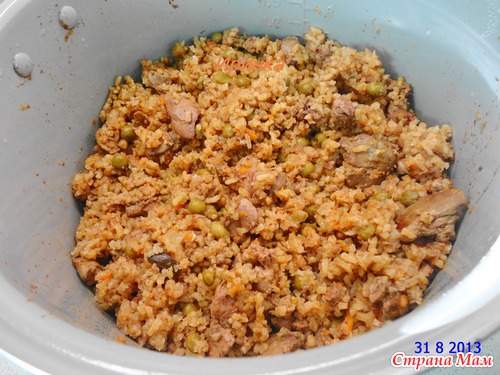 После этого кладем стакан промытого до чистой воды риса, зеленый горошек, соль, специи, перемешиваем.