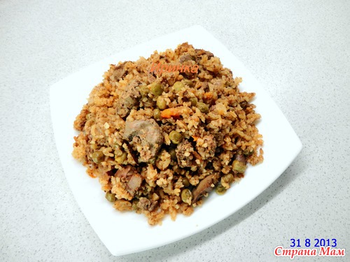 Куриная печень с рисом и зеленым горошком.