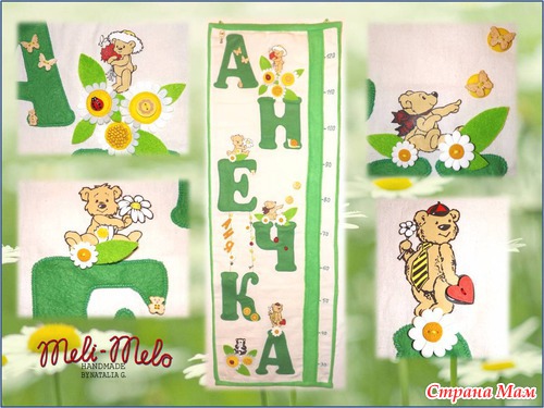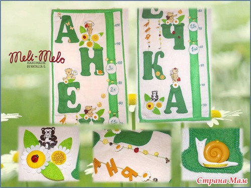 А ещё я попросила замечательную девушку Катю (Хасю) http://hasja.stranamam.ru/, почти мою соседку (в двух остановках друг от друга живем), которая является мастером по изготовлению украшений из полимерной глины, и она в срочном порядке налепила мне ромашек, буковок и улитку для украшения ростомера