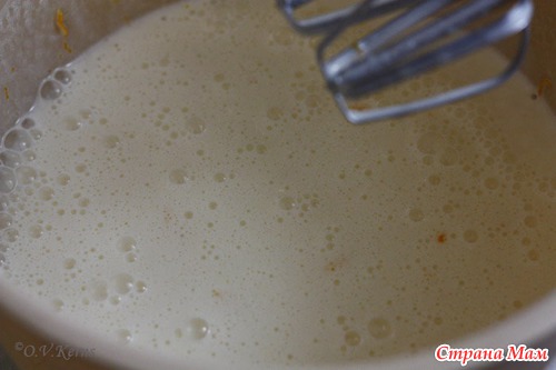 Яйца взбить с сахаром до пышности, минуты 4. Добавить цедру, оливковое масло, продолжая взбивать. Снизить скорость миксера до минимума, влить апельсиновый сок, затем молоко, хорошо все перемешать. Сок выжала из одного апельсина, как раз.
