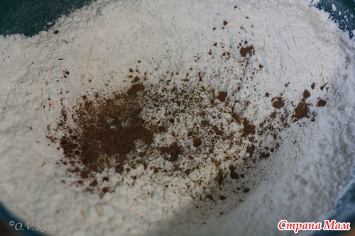 Муку смешать с разрыхлителем, солью и пряностями. Всыпать мучную смесь в яичную, хорошо перемешать.