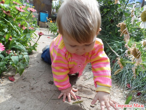 на улице сильно много не ходим, ей сразу интересно траву подергать и песок поковырять