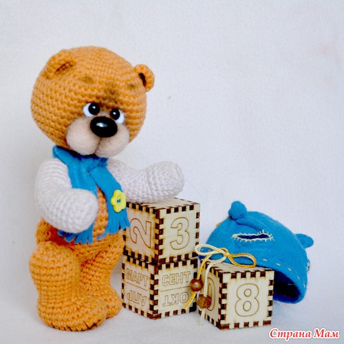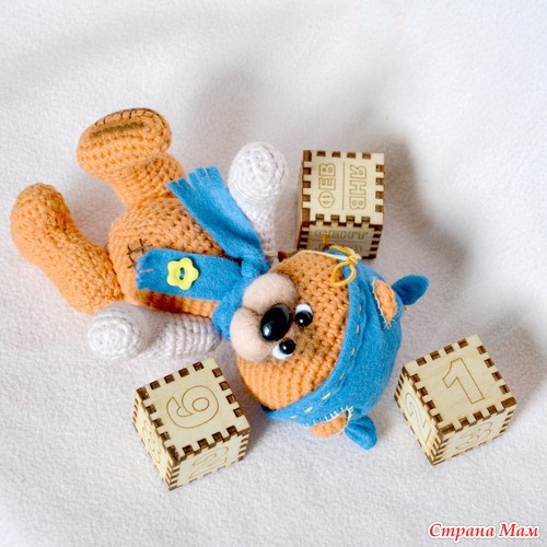 Вязаный малыш Апельсинкин. Очень любит осень с ее рыжими, желтыми и бурыми цветами. Он еще совсем маленький, поэтому любит играть с кубиками.