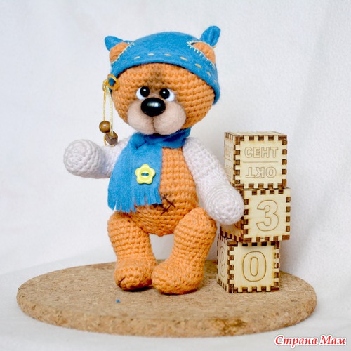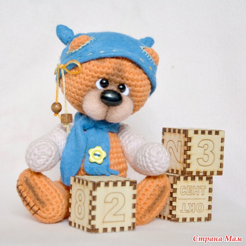 Связан мишутка из хлопковых ниток по технологии тедди: шестишплинтовое крепление (голова на двойном), набит холофайбером, глазки - стекло, нос - пластик. Тонирован сухой и масляной пастелью. Утеплен к осени фетровой шапочкой и шарфиком с желтой пуговкой. По вопросам приобретения можно заглянуть сюда: http://www.livemaster.ru/item/4148509-kukly-igrushki-vyazanyj-mishka-apelsinkin