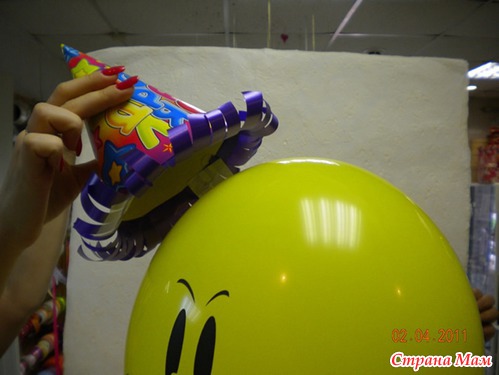 Шаг 5. Надуваем «голову» клоуна. Для этого используем шар (12-14 дюймов) с рисунком «Улыбка». «Голову» клоуна привязываем к «туловищу».