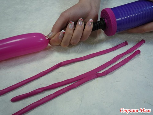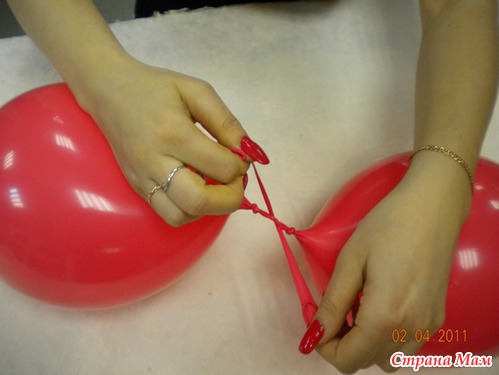 Шаг 7. Из 2 шаров для моделирования делаем клоуну «руки». На конце шара путем скручивания имитируем «пальчики». «Руки» привязываем в месте соединения «головы» и «туловища» (фото 6, 7).