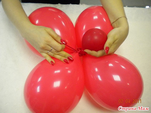 Шаг 4. Создаем «туловище». Для этого надуваем самый большой шар (18 дюймов). «Туловище» привязываем к подставке (фото 4)