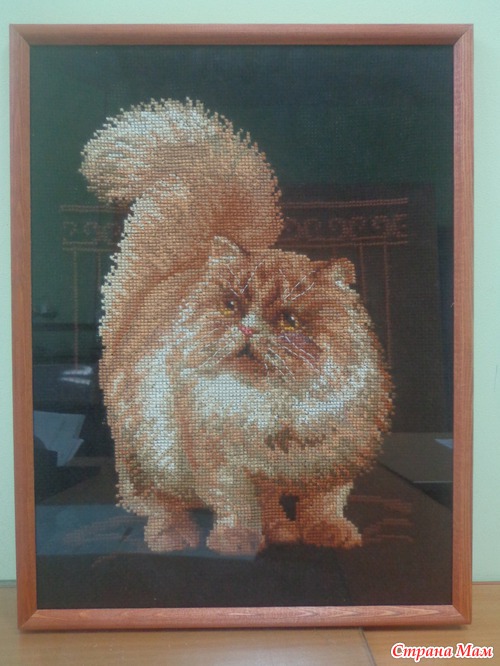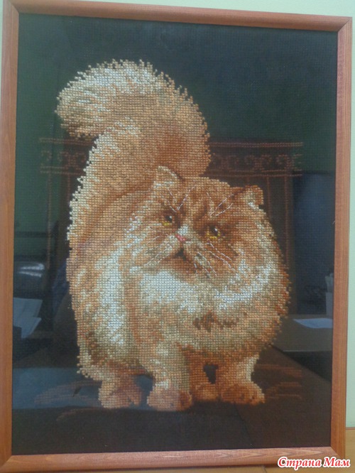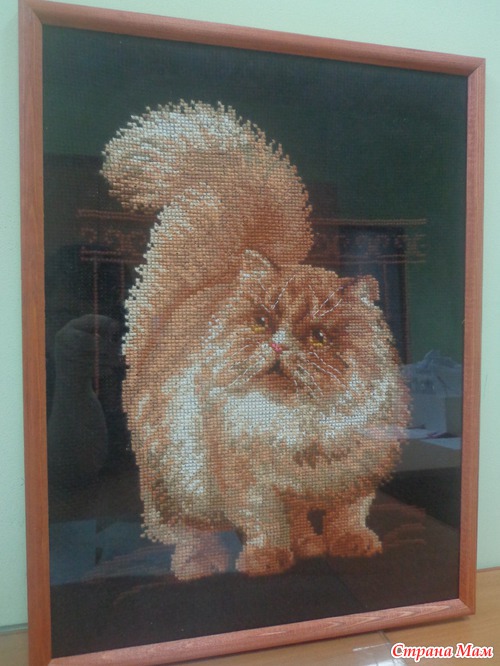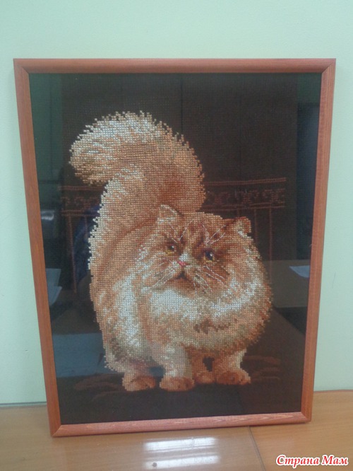 Вчера моя сотрудница Эльвира принесла вышитого котика на работу, я обомлела, на меня смотрел как живой (мой котик). Все ходили и восхищались ее работой, а мне так захотелось его для себя тоже вышить, вот думаю как быть, зрение у меня не очень, хоть канва и крупная, но черная, кто вышивал на черной канве посоветуйте. Не удержалась сфотографировала кота, рамочка у нее простая, а стекло отсвечивает, как я не старалась по всякому ее поворачивать, все равно отсвечивает. Вот он этот кот-а мог бы быть и моим!