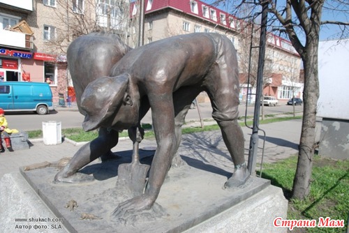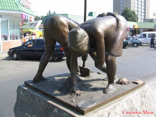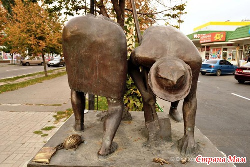 Памятник стоит на площади возле центрального рынка. На нем изображены двое дачников в процессе сбора колорадского жука. Все уверены что это памятник дачникам. Но все не так просто! Внизу памятника расположен огромный колорадский жук, он тащит надпись: