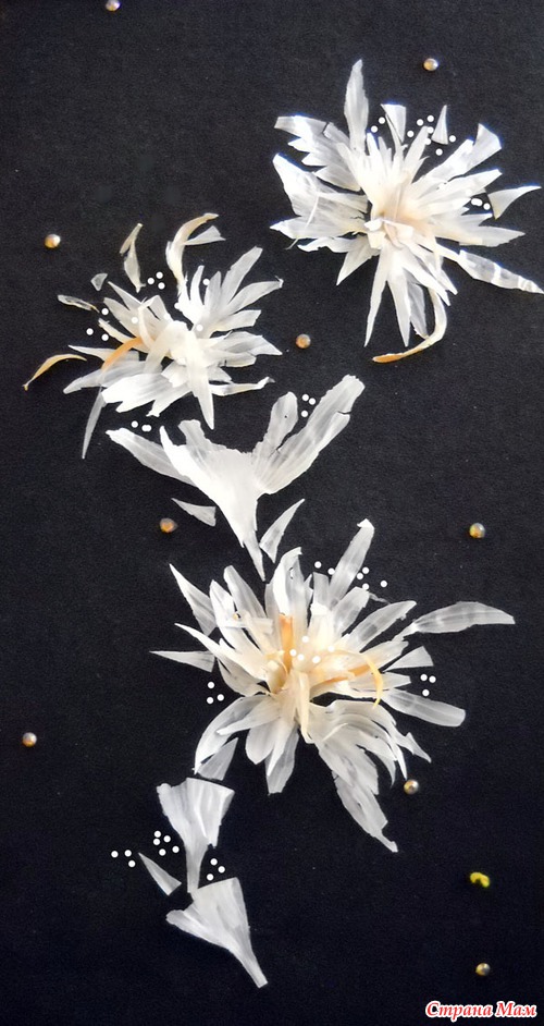 Очень интересный поделочный материал - чесночная шелуха. Мы с племянником попытались сделать цветочный мотив. Для украшения применили маленькие стразики.